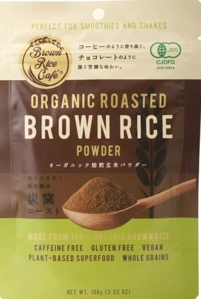 Brown Rice Cafe オーガニック焙煎玄米パウダー 100g 焙煎された国産有機玄米を微粉末化した日本発スーパーフード。コーヒーのように香り高く、チョコレートのような芳醇な味が特長。焙煎には炭窯の余熱を利用しており、遠赤外線によって独特の焙煎香がひきたちます。