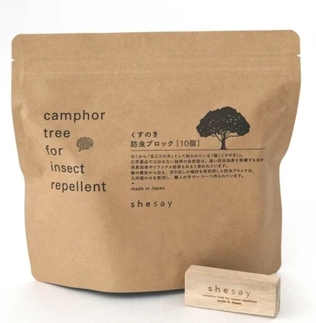 『虫よけの木』といわれる楠(くすのき)より作られた虫よけ。 **CAMPHOR** 「虫よけの木」として知られている「楠(くすのき)」。 独特な芳香を持つことから「臭し(くすし)」や「薬」が「クス」の語源となったといわれています。 オランダ語でカンフルといい、医薬品・香料・セルロイドの原料など、古くより世界中で様々な用途に使われてきました。 楠の持つメンソールやユーカリのような清涼感あふれるさわやかな香りは、虫を寄せ付けない効果があることから、昔から防虫として使われてきました。 楠の木片を水蒸気蒸留で抽出し結晶化させたものが、「樟脳」といわれる天然の防虫剤です。 揮発性に優れているので衣装ケースから出した時は樟脳の香りがしっかりとしますが、空気や天日にさらせば香りがなくなります。 化学物質などが含まれていないので、環境に敏感な方にも優しい防虫剤です。 かつては専売品として国益の一翼を担うまでの産業だった天然樟脳ですが、安価な合成防虫剤の普及や需要の減少から現在生産しているのは数社のみになっている大変貴重なものです。 *タンスの引き出しに2〜3個、衣装ケースに4〜5個ぐらい、隅に入れてお使いください。 (効果は約半年)
